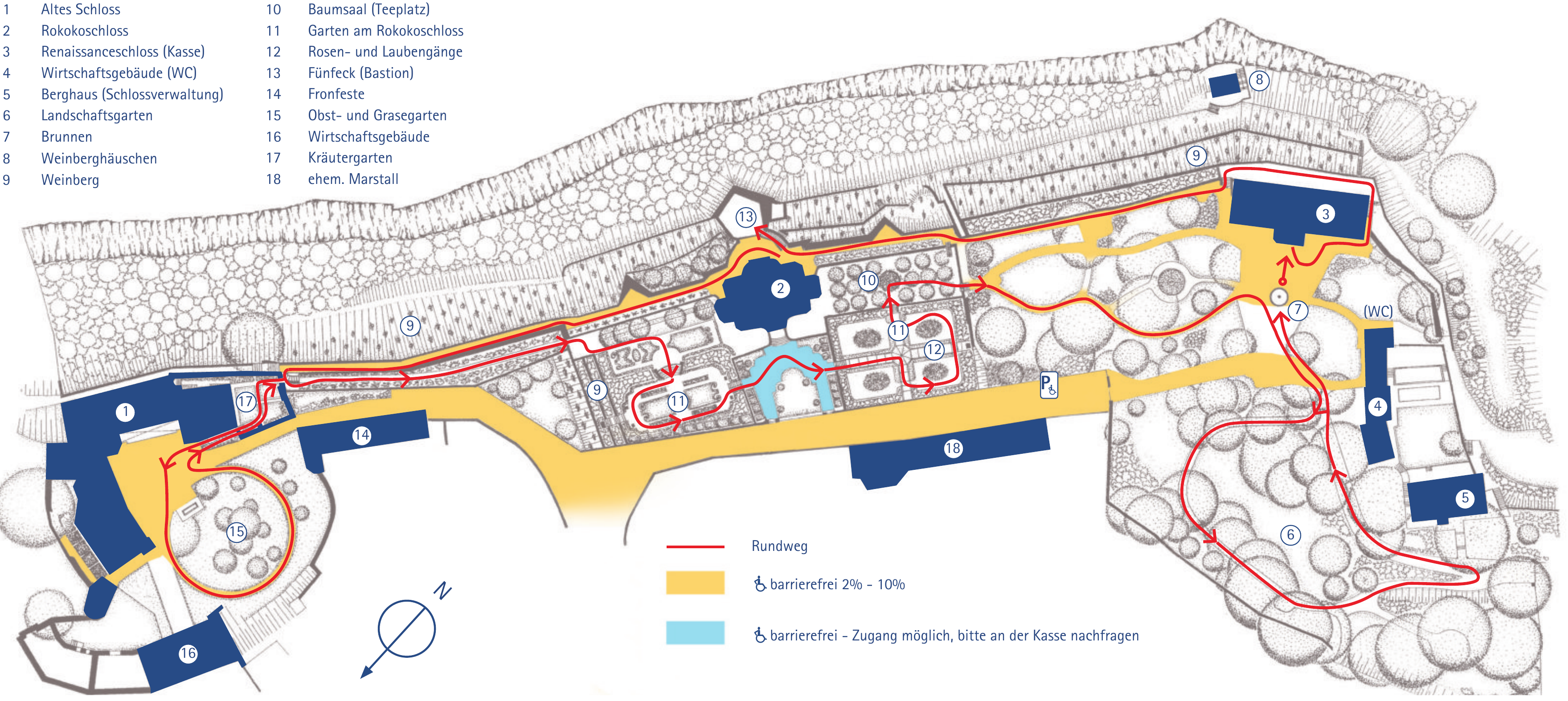 The first designs for the garden at the Rococo Palace date from 1735/36. In the early 19th century, additions included the Ash Walk (Eschengang), the tea lawn with the “acacias,” the rose arbor walk, and numerous rose trellises. From 1824, the garden designer Carl August Christian Sckell created the small landscaped garden by the Renaissance Palace—with winding paths, groups of trees and shrubs, and flowerbeds—for Grand Duke Carl August of Saxe-Weimar-Eisenach.