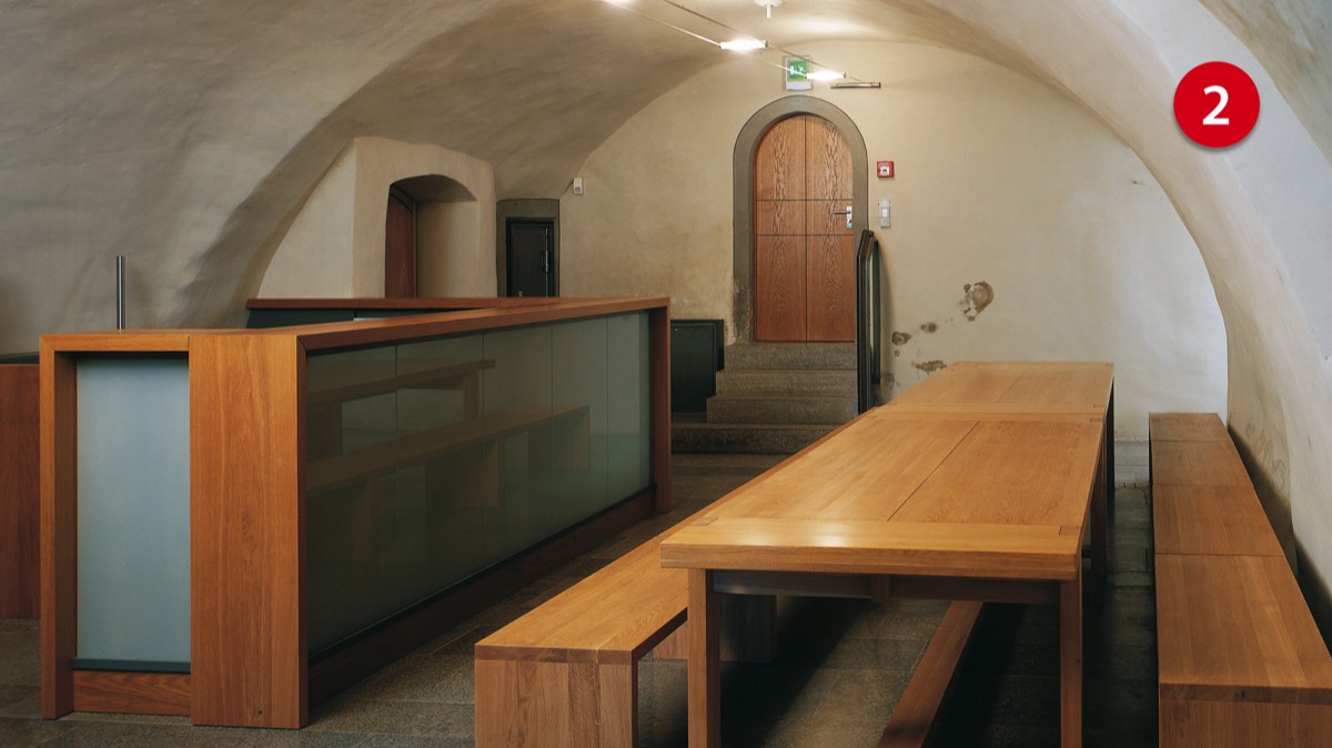 In the mid-16th century, the Old Palace took on the appearance it has today. It combines four structures from different periods, unified through consistent façade colors and window forms. The keep, for example, dates back to the 12th century. A late medieval Kemenate (heated living quarters) was also incorporated into the complex. By contrast, the south wing was newly built in the Renaissance style and contains two large halls. Alongside the impressive wooden ceilings, painted Renaissance ornamentation has been preserved.