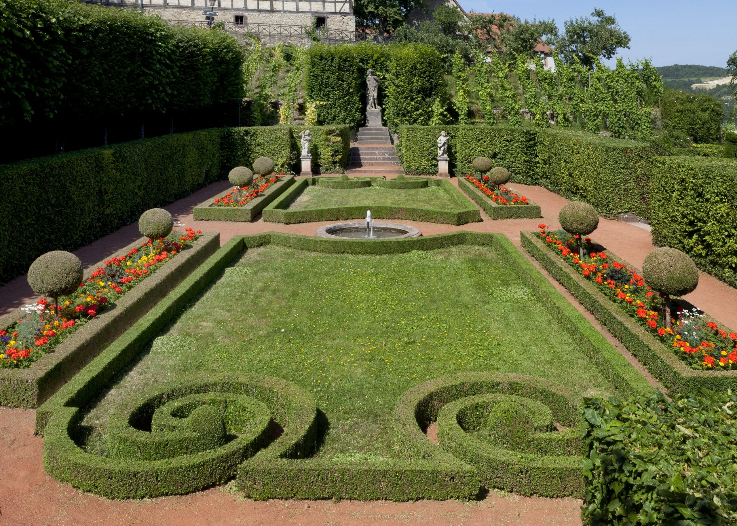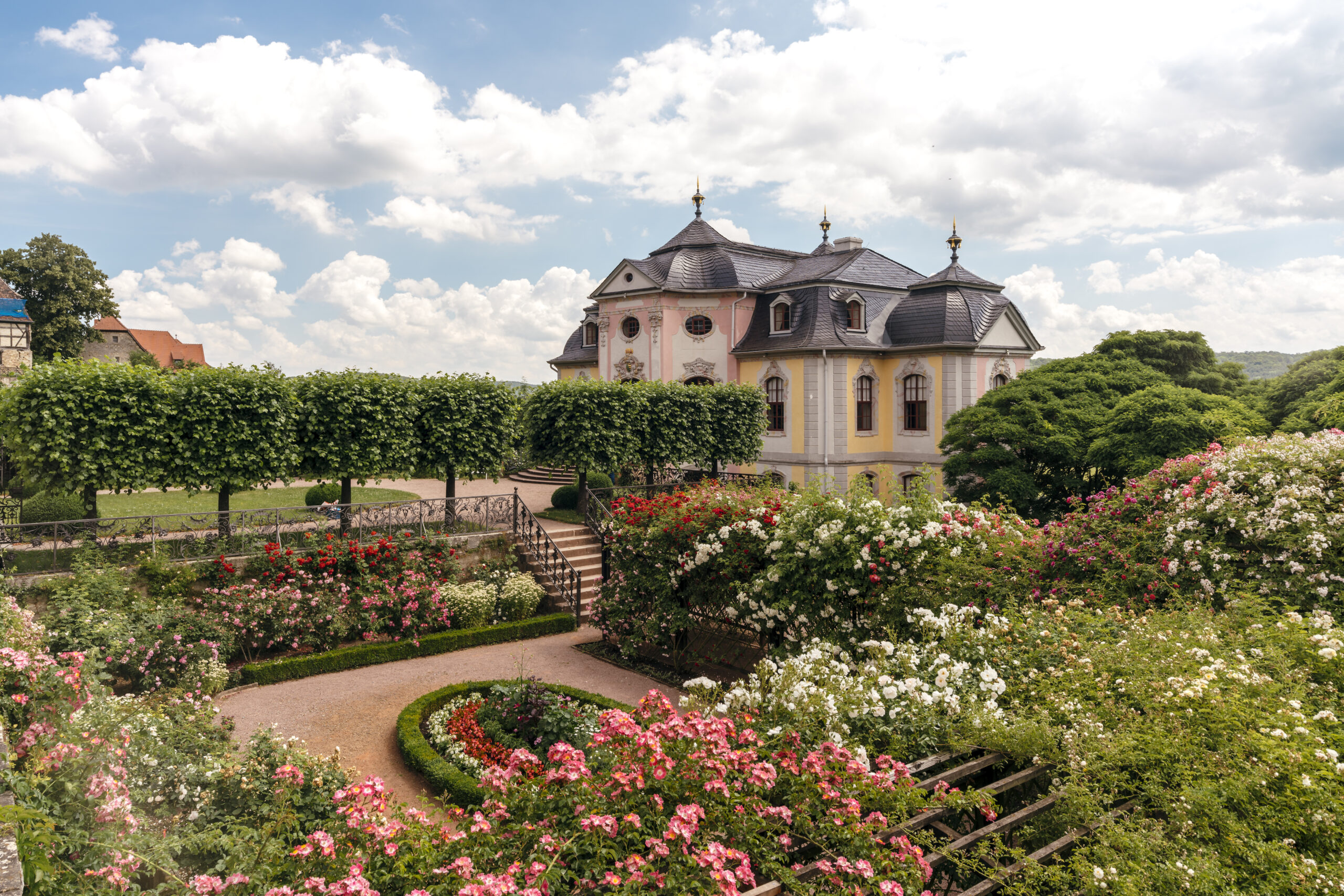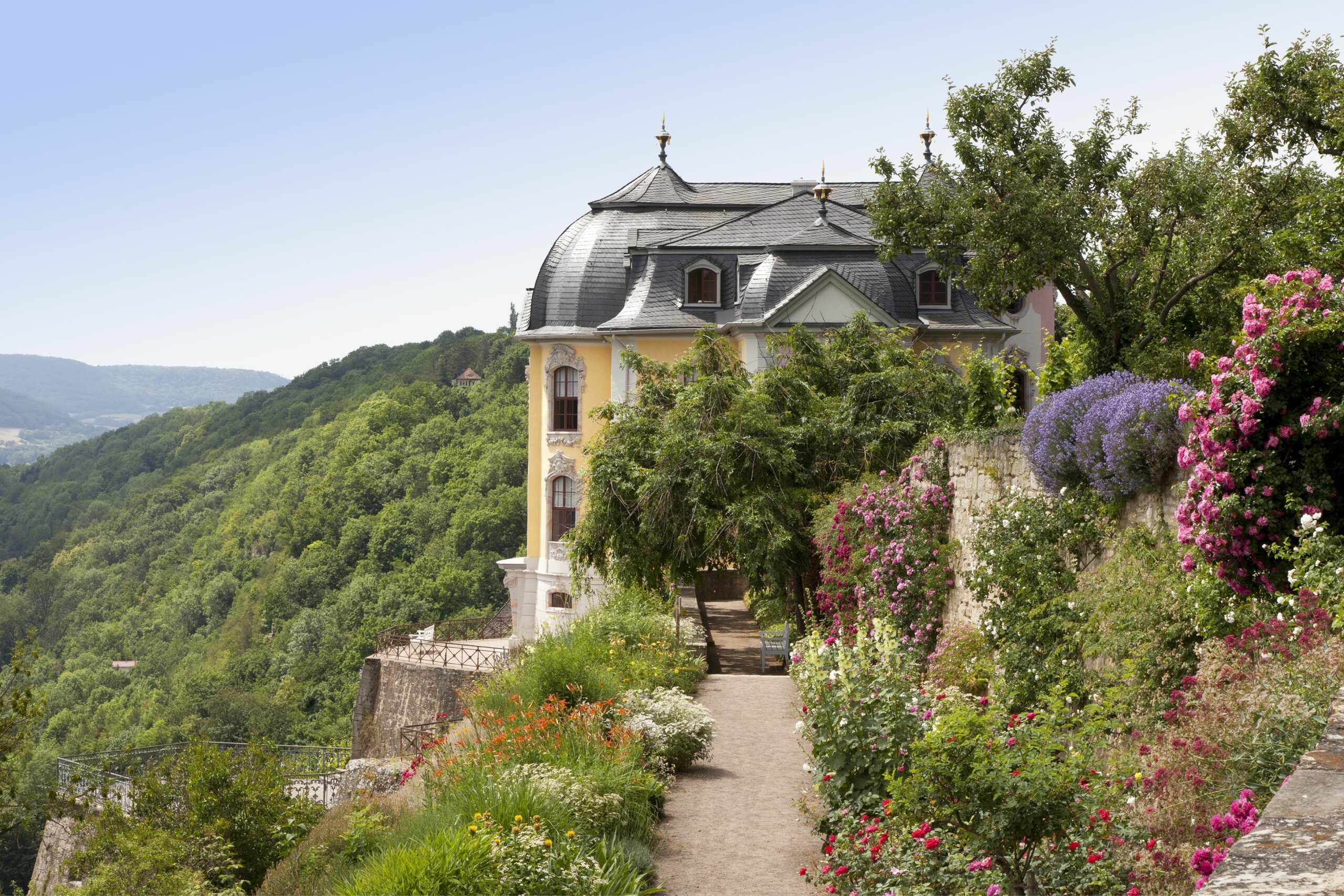 The Dornburg Palace Gardens cover around four hectares and include several distinct garden areas: the landscaped park by the Renaissance Palace, the formally designed geometric garden in front of the Rococo Palace, and the orchard and grass garden near the Old Palace. From 1736 onward, the steep slopes down to the River Saale below the palaces were converted into vineyards.